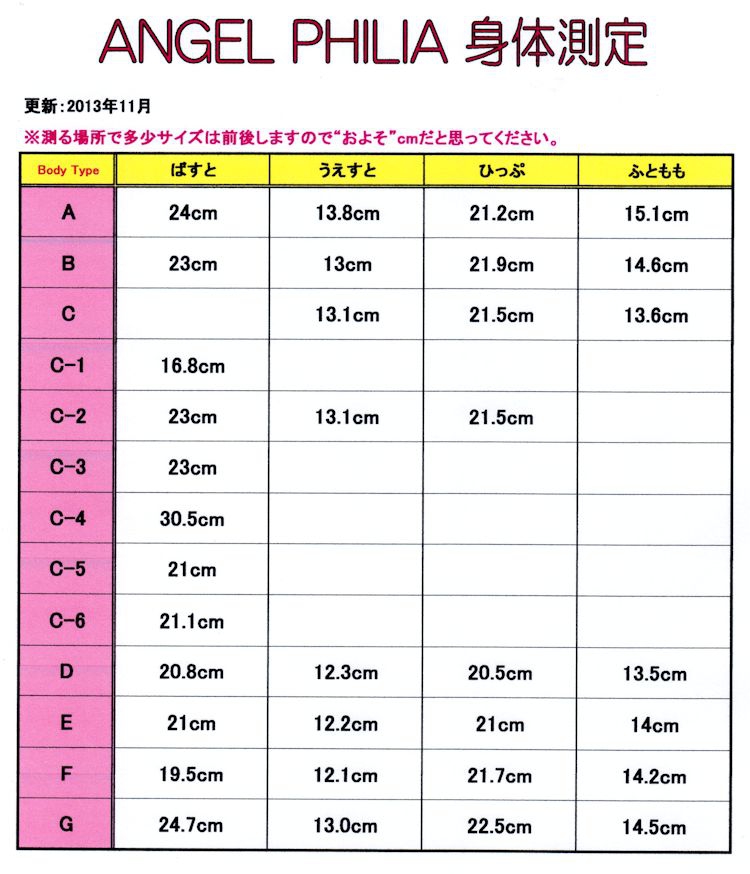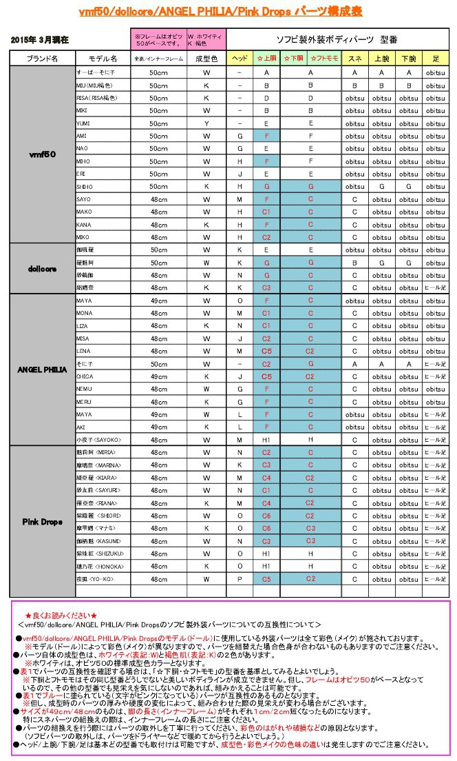 vmf50・dollcore・ANGEL PHILIA・Pink Dropsのパーツ表と身体測定表です。
